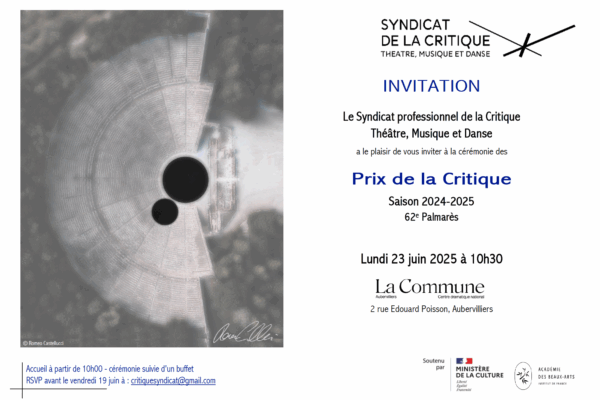 LAUREAT.E.S PRIX DE LA CRITIQUE 2023-2024 Nous avons fêté le 61e Palmarès au Théâtre de la Ville-Sarah Bernhardt le jeudi 6… lire la suite